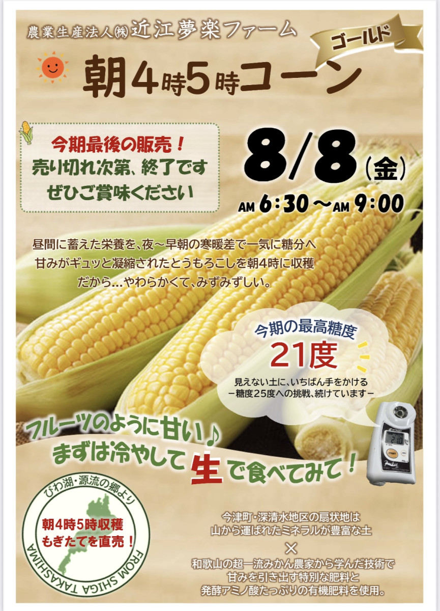 🌽朝4時5時コーン【ゴールド】 今季最終販売のお知らせ🌽 2025/08/02 朝4時5時コーン【ゴールド】ですが、今期の最終販売を8/8(金)に予定しております。 今季最終の収穫・販売となります。 今季の最高糖度21度✨ 新鮮でフル-ツのような甘みたっぷりのとうもろこしを是非、 まずは冷やして”生”で食べて見て下さい! 皆様のお越しをスタッフ一同、心よりお待ちしております。 【注意】 今回は販売時間が変更になっておりますので、お気をつけくださいませ。